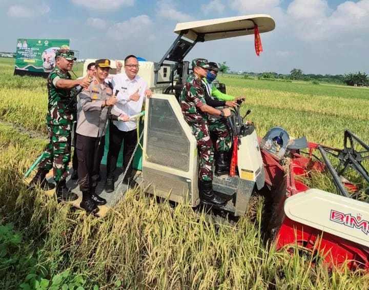 Foto: Wakil Bupati Gresik, dr Asluchul Alif didampingi Dandim 0817 Gresik, dan Kapolres Gresik panen raya padi di Desa Mulung, Driyorejo.