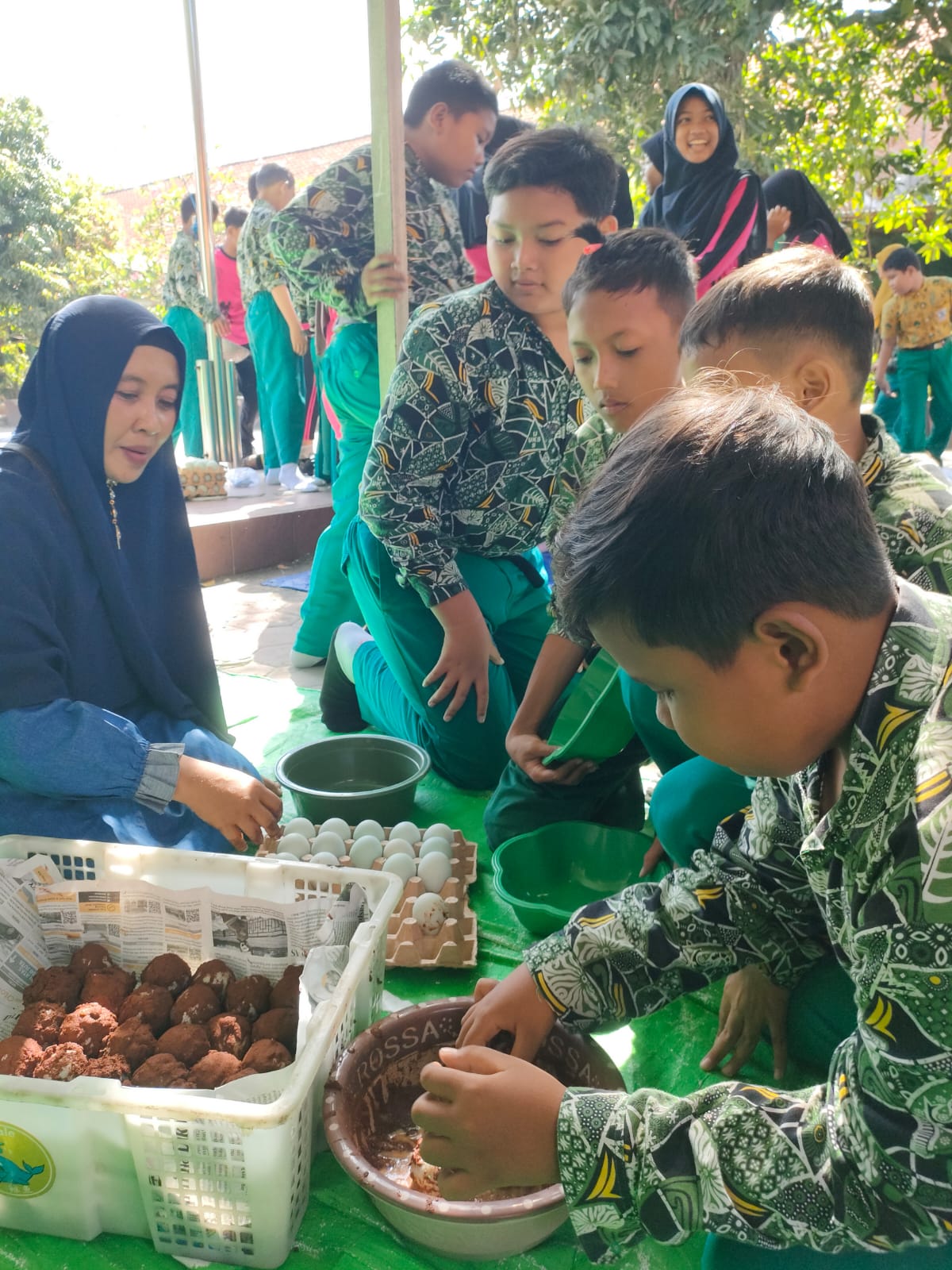 Para siswa tampak bersemangat saat mempraktikkan cara melumuri telur dengan adonan garam dan abu bata. Selain belajar teknik pembuatan, mereka juga diajak mengenal peluang usaha berbasis potensi lokal. Hal ini sejalan dengan upaya sekolah menanamkan nilai kreativitas, kemandirian, dan jiwa kewirausahaan sejak dini.