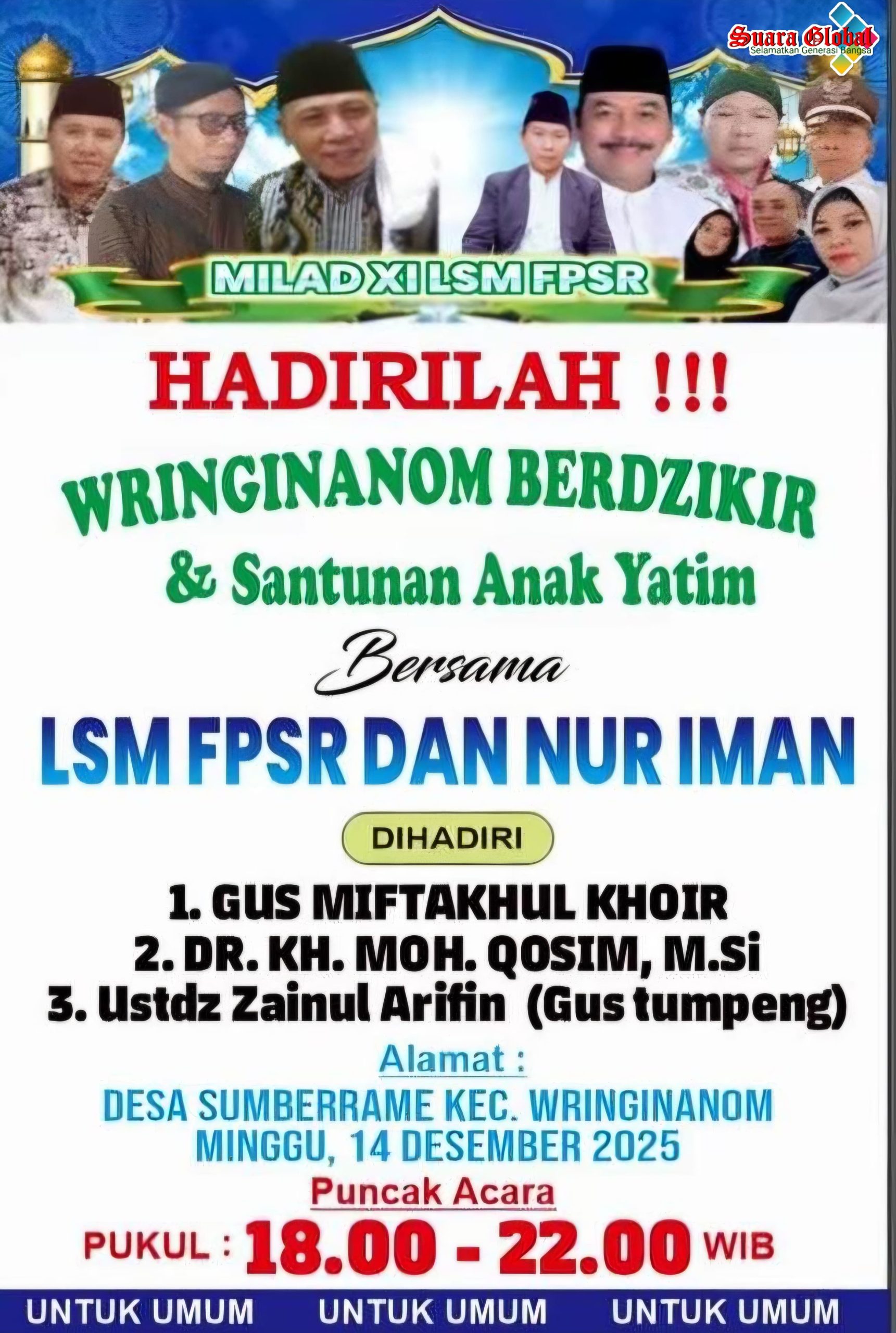 Gresik, SuaraGlobal.Net – Peringatan Milad XI LSM Forum Peduli Sosial Rakyat (FPSR) akan digelar secara istimewa melalui kegiatan keagamaan bertajuk “Wringinanom Berdzikir & Santunan Anak Yatim.” Acara yang bekerja sama dengan jamaah Nur Iman ini akan berlangsung pada Minggu, 14 Desember 2025, di Desa Sumberrame, Kecamatan Wringinanom, mulai pukul 18.00 hingga pukul 22.00 WIB.