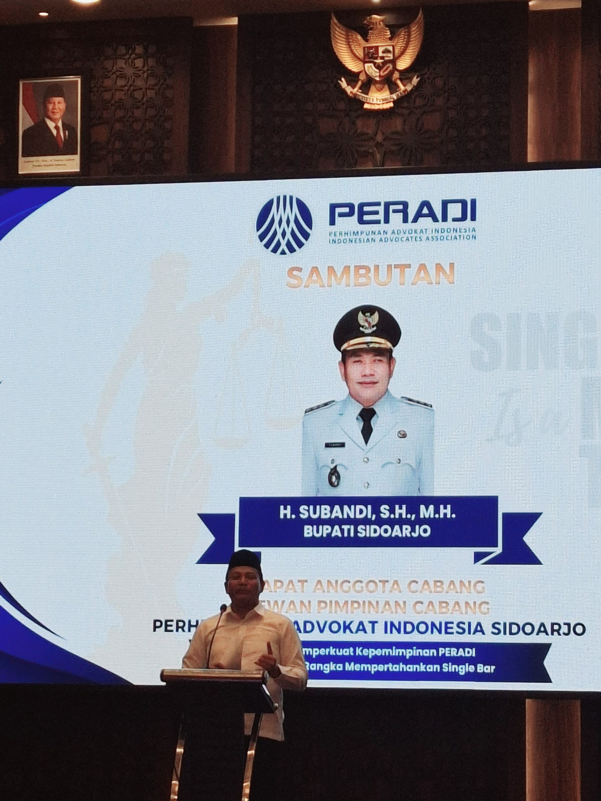 Bupati Sidoarjo, H. Subandi, S.H.,M.Kn dalam sambutannya mengatakan. “Pemerintah Sidoarjo akan mendukung penuh DPC Peradi sidoarjo bertujuan ingin membangun pendampingan hukum yang lebih baik untuk masyarakat sidoarjo.”