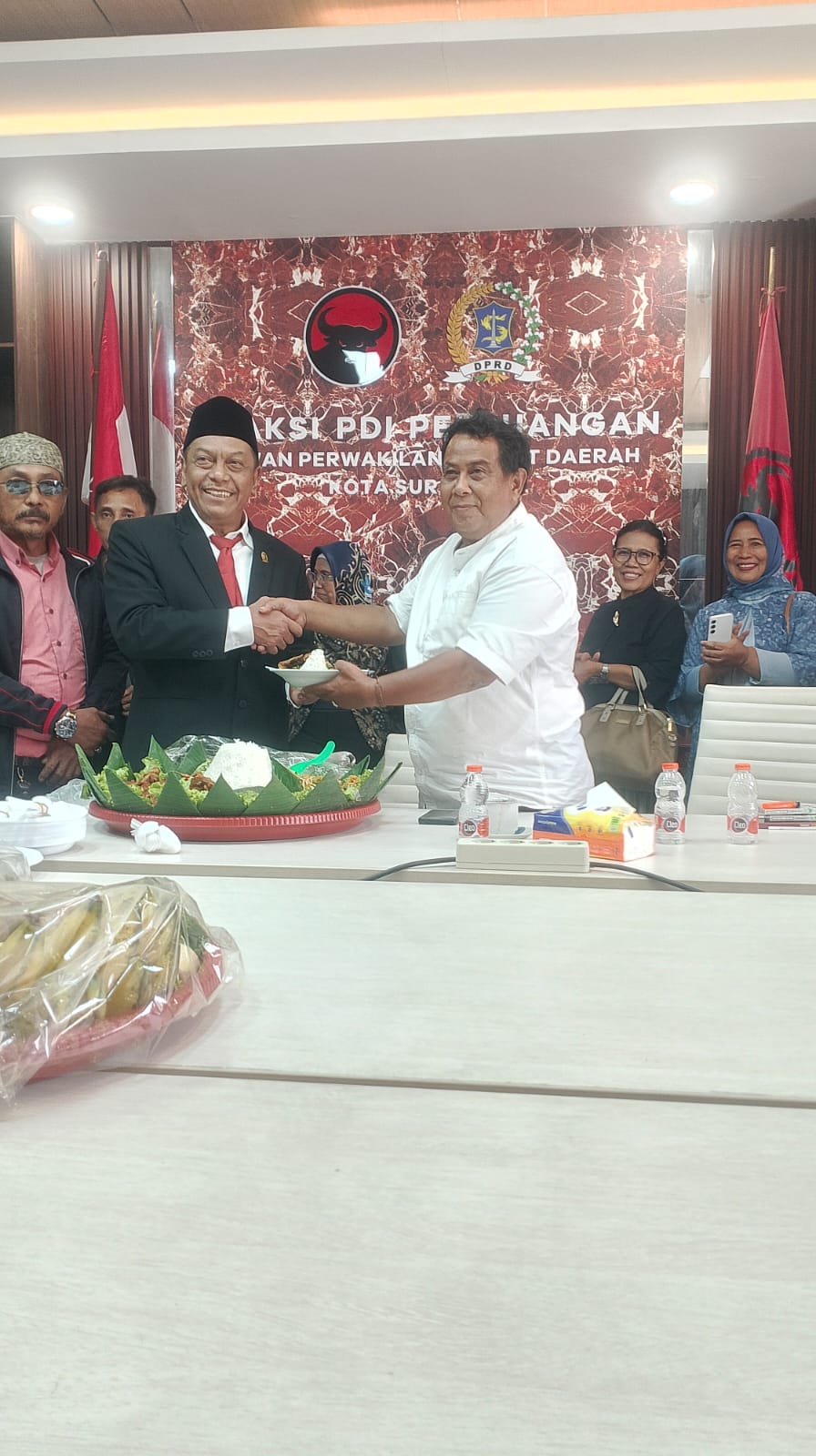 Foto : Anas Karno, S.H.,S.E. menyerahkan potongan tumpeng ke Sukadar, S.H. (Wakil Ketua Bidang Organisasi DPC PDI-P kota Surabaya).